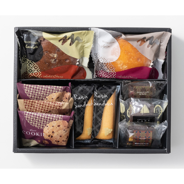 | 内容 | レーズンサンド・レーズンクッキー×各2個、ブラウニー(ネーブル・ドライフルーツ&ナッツ)・マドレーヌ(プレーン・チョコ)・チョコレートケーキ・チョコチップクッキー×各1個 |